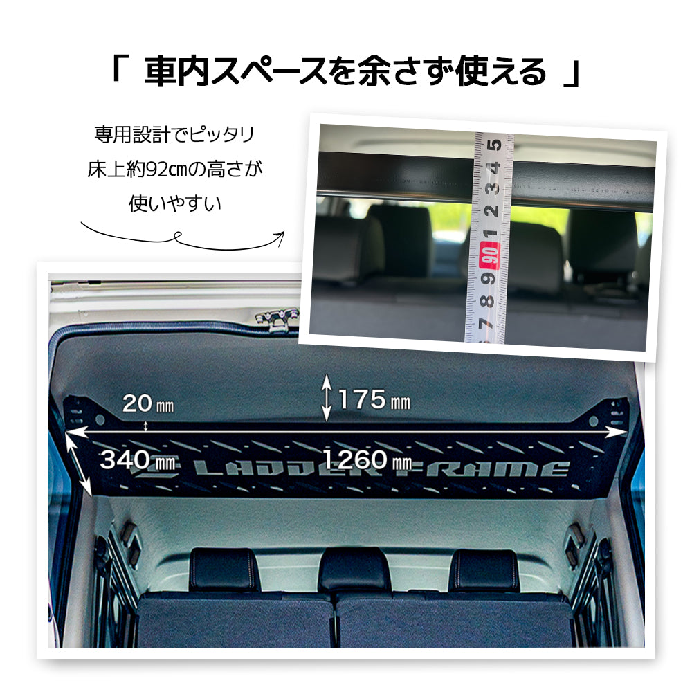 It's a specially designed rear rack, so it's the perfect size. The surface treatment uses cationic electroplating, which is also applied to the original undercoat. Makes storage inside the car smarter. LADDER FRAME (ladder frame) cutout logo specification.